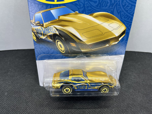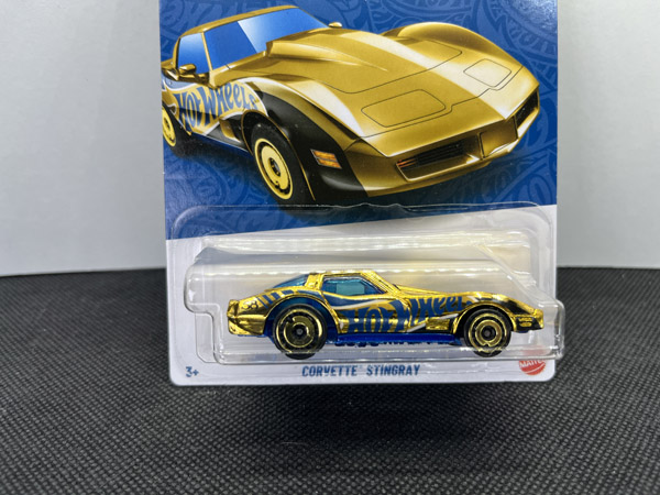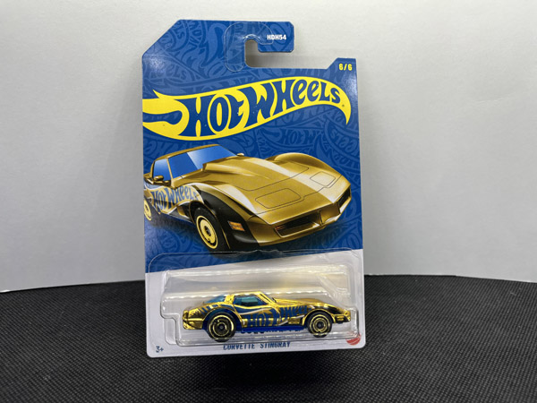 The centerpiece of the 58th Anniversary set is the Corvette Stingray Gold CHASE, finished in full gold chrome with blue anniversary graphics. Produced in limited quantities, this chase variant is the most desirable piece in the series, combining iconic Corvette styling with premium anniversary treatment and making it a top target for Hot Wheels collectors and chase hunters alike.